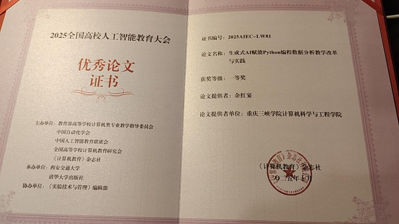 2025年10月17日至19日,全国高校人工智能教育大会在陕西西安召开。计算机科学与工程学院教师余红宴博士参加了此次会议。他撰写的教改论文《生成式AI赋能Python程序设计数据分析教学改革与实践研究》荣获会议论文评比一等奖。