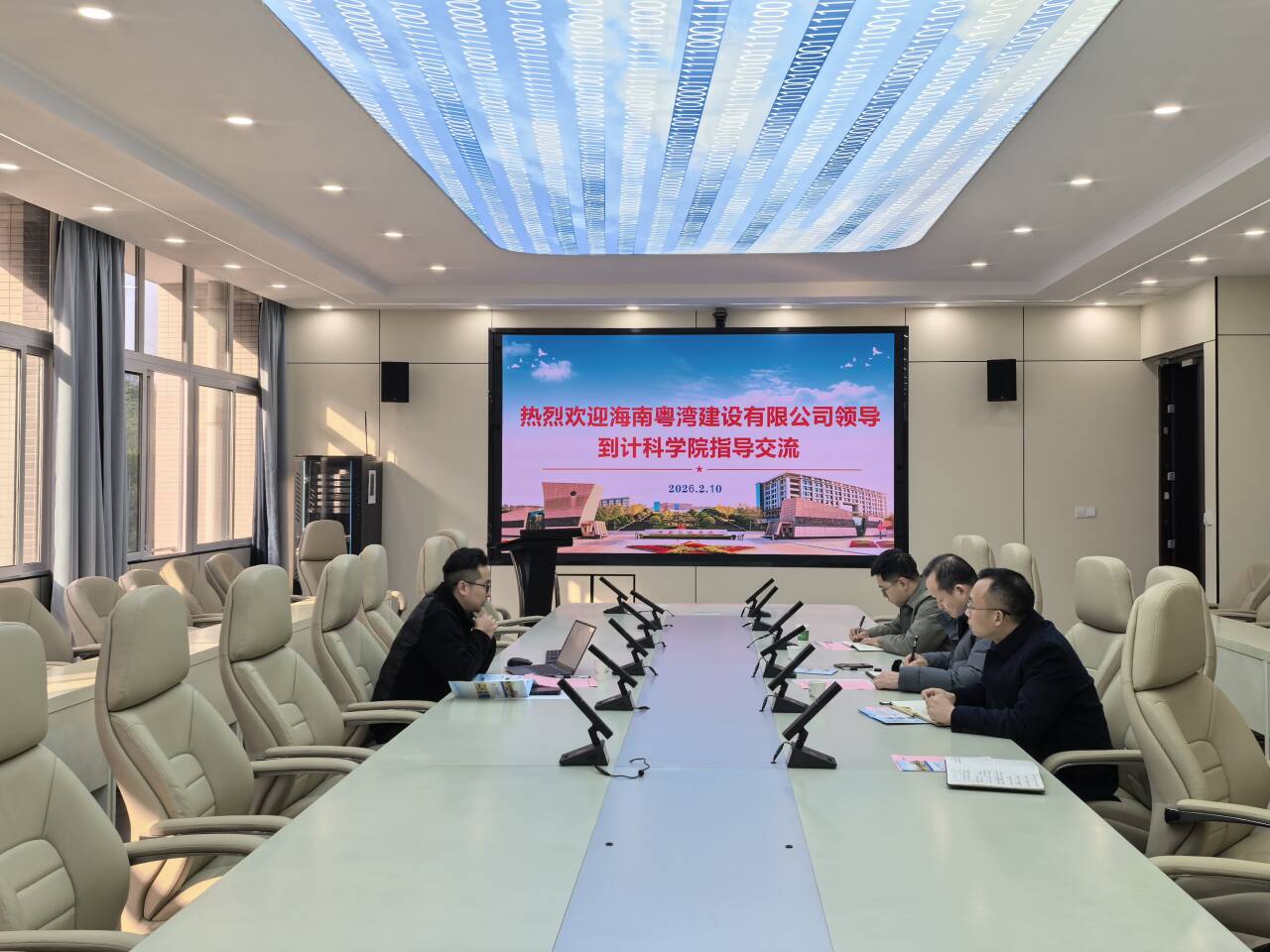 2月10日上午,海南粤湾建设有限公司CEO杨兴华到访计算机科学与工程学院。学校党委常委聂祥飞副校长、计科学院李洪兵、马龙、周政等老师在慎思楼三栋306会议室与来访企业进行了交流,双方围绕产教融合、实验室共建、校企合作等方面进行了深入的探讨。