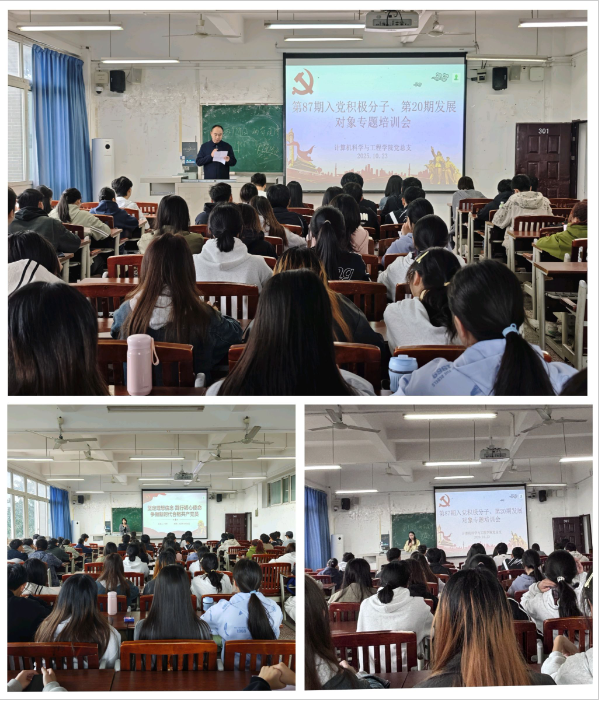 为严把党员发展质量关,加强对入党积极分子和发展对象的培养教育,10月23日下午,计算机科学与工程学院党总支在明辨楼1-301组织开展第87期入党积极分子和第20期发展对象专题培训会,77名学员参加。