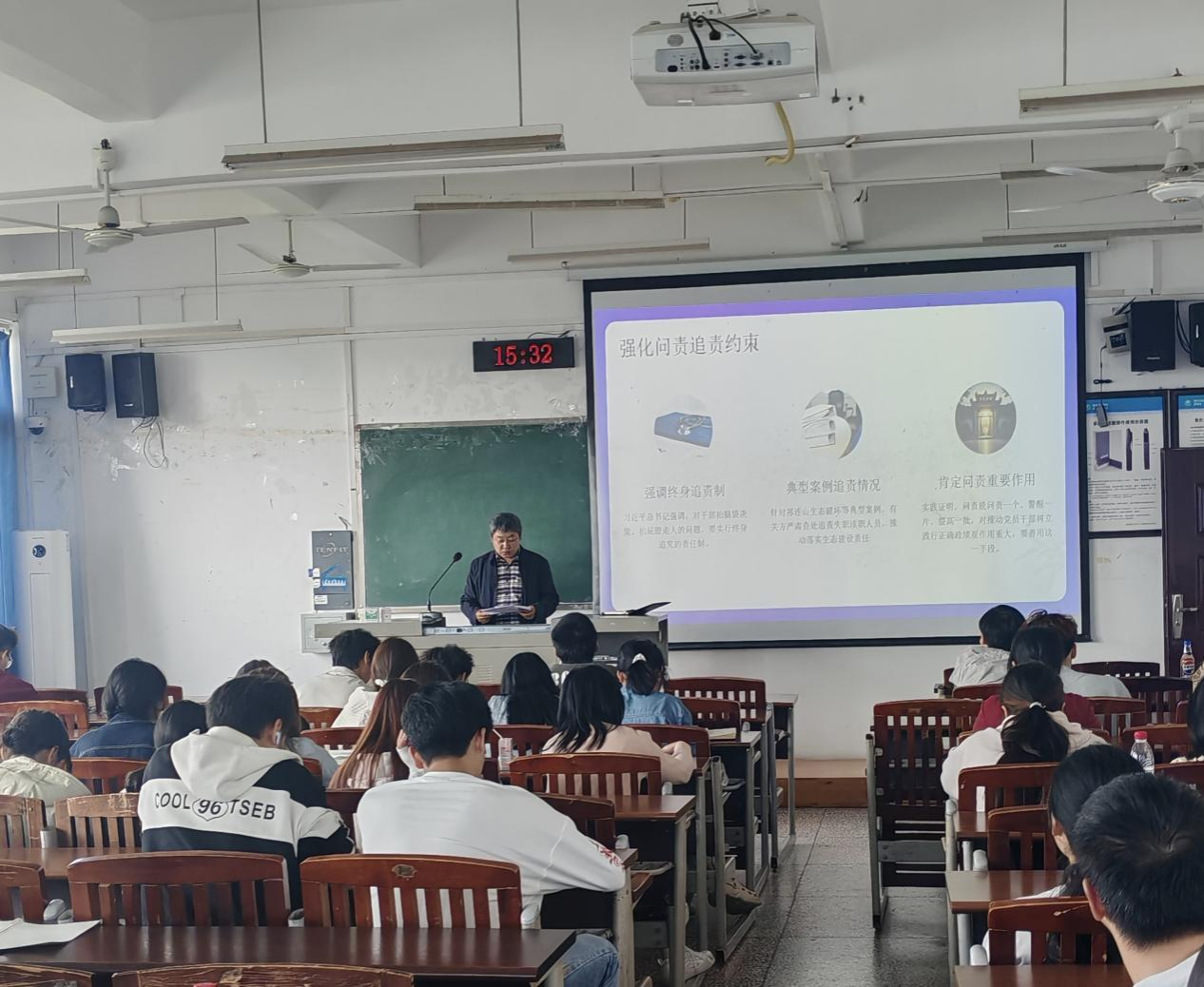党总支副书记廖红富以“树立和践行正确政绩观”为题授课,主要围绕“政绩为谁而树、树什么样的政绩、靠什么树政绩”等根本问题,系统阐释了正确政绩观的核心内涵与实践要求。他强调,为民造福是最大政绩,必须坚持以师生为中心,把心思和精力用在打基础、利长远、出实招、求实效的事情上,坚决反对形式主义与急功近利。他要求全体学员将正确政绩观内化于心、外化于行,在专业学习、科技竞赛、服务师生中担当实干,以实际行动争取早日成为一名合格的共产党员。