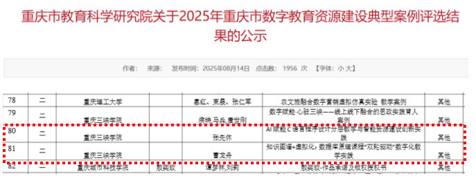 近日,重庆市教育科学研究院公布了2025年重庆市数字教育资源建设典型案例评选结果。我院张先休老师申报的作品《AI赋能C语言程序设计分层教学与智能资源建设创新实践》和曹龙舟老师申报的作品《知识图谱+虚拟化:数据库原理课程“双轮驱动”数字化教学实践》荣获高等教育学段二等奖。
